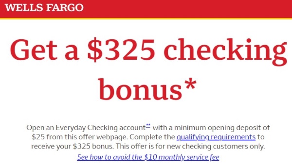 Yes, new Wells Fargo customers can get $325 when they open a new account with $25 and receive a total of $1,000 or more in qualifying direct deposits into the new checking account within 90 days from account opening.