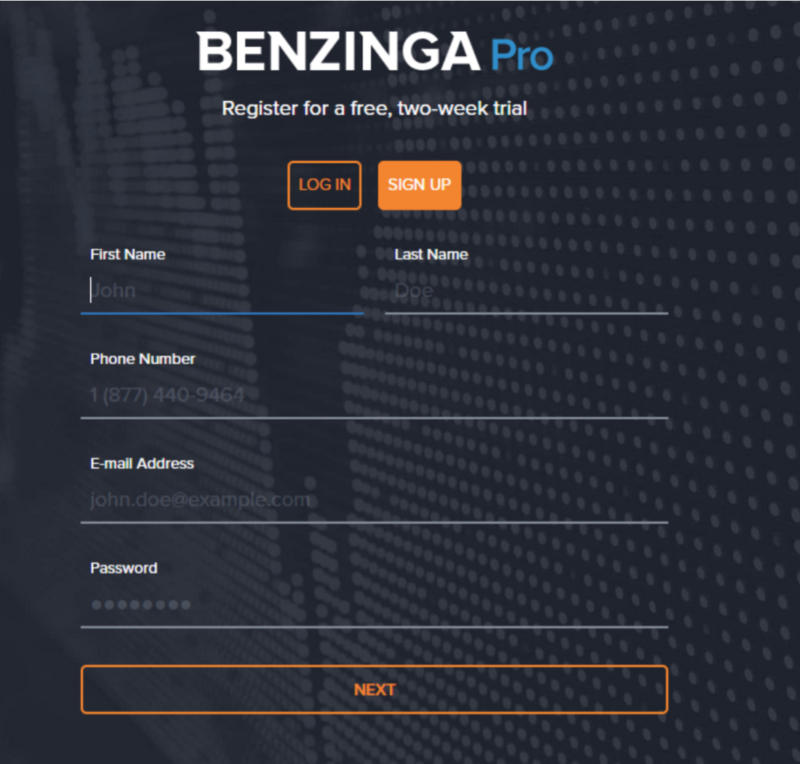 You can sign up for Benzinga Pro directly from the website. You’ll be asked to provide your name, phone number, and email address, then create a password.