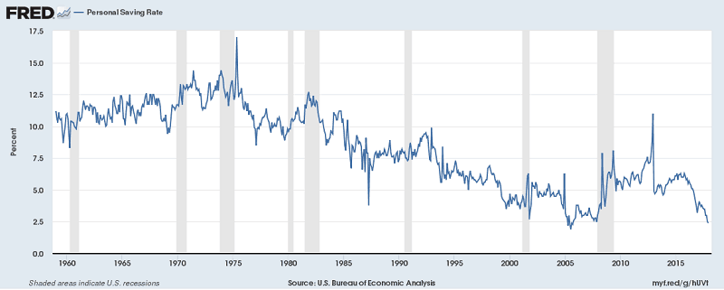 The savings rate, as measured by the St. Louis Fed, has been in the low to mid-single digits for quite some time. It was just 2.4% in December 2017. It has since improved to 6.0% in November 2018.