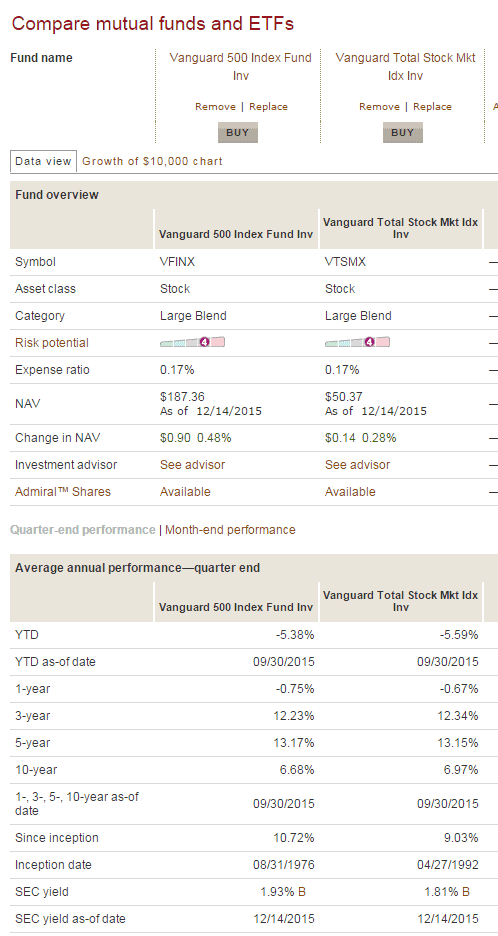 Vanguard 500 Index Fund and the Vanguard Total Stock Market Index fund are two different funds but they're very close. The S&P500 makes up around 75% of the market so we have a lot of good overlap. If you were looking at a loss this year in the S&P500 fund, you could harvest those tax losses and put them into the Total Market fund. Wait 31 days, then go back to the S&P 500 fund.